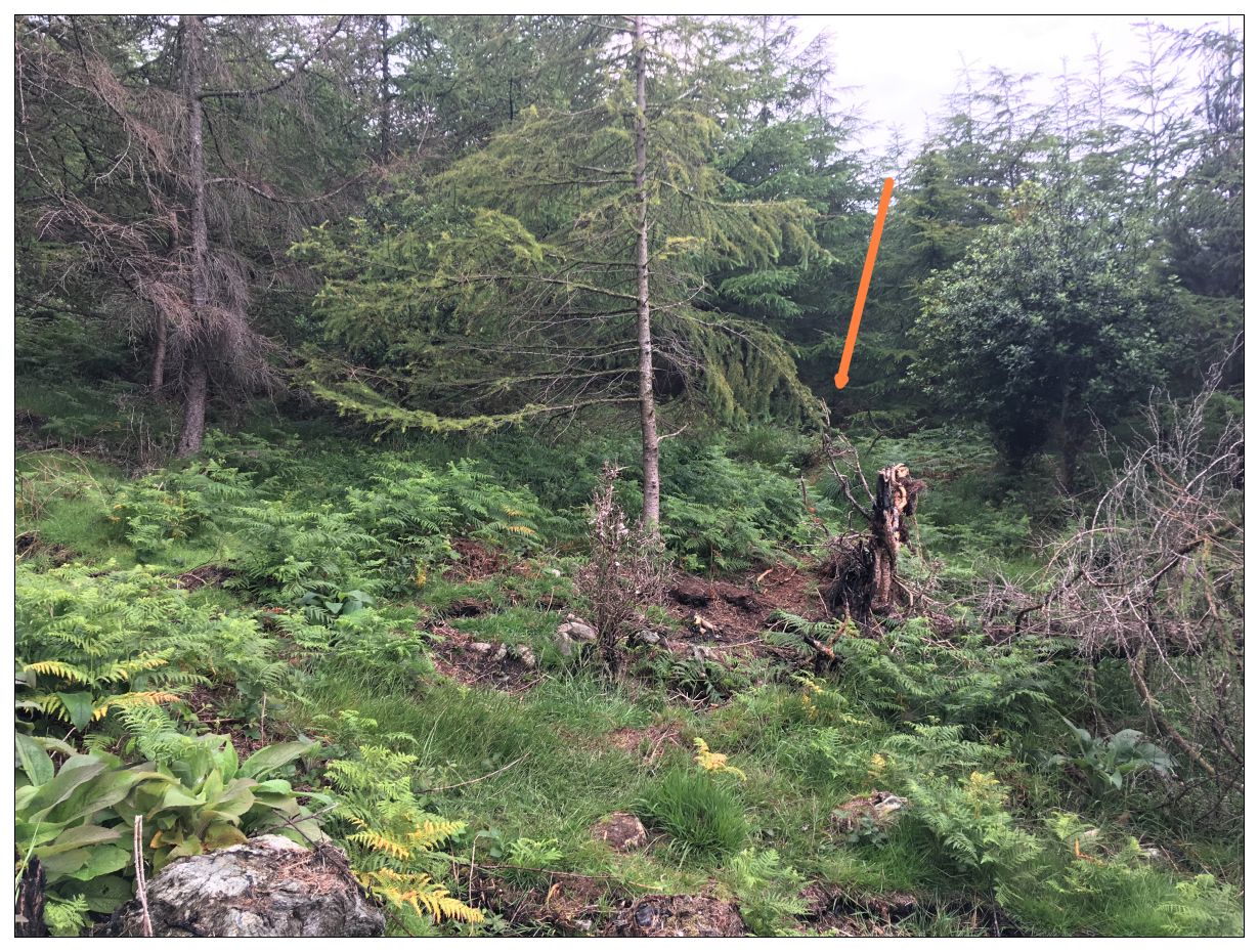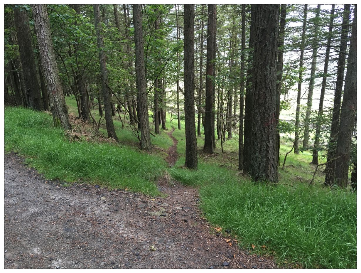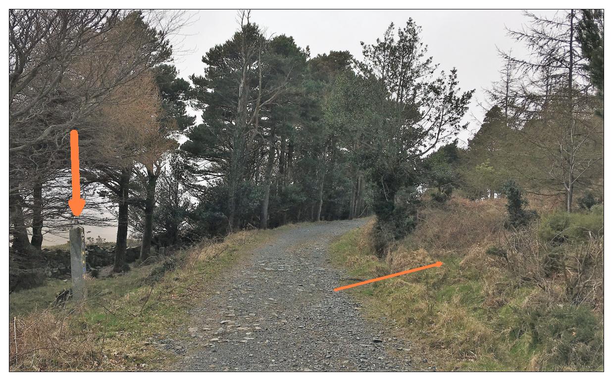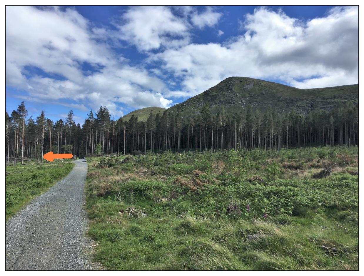 Your route now cuts back to the left towards Donard Forest along the forest track for about 100m where a small dirt path leaves the track and makes its way to a corner of the boundary wall and metal bar stile.