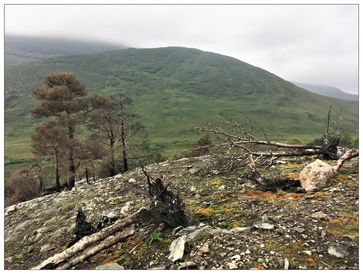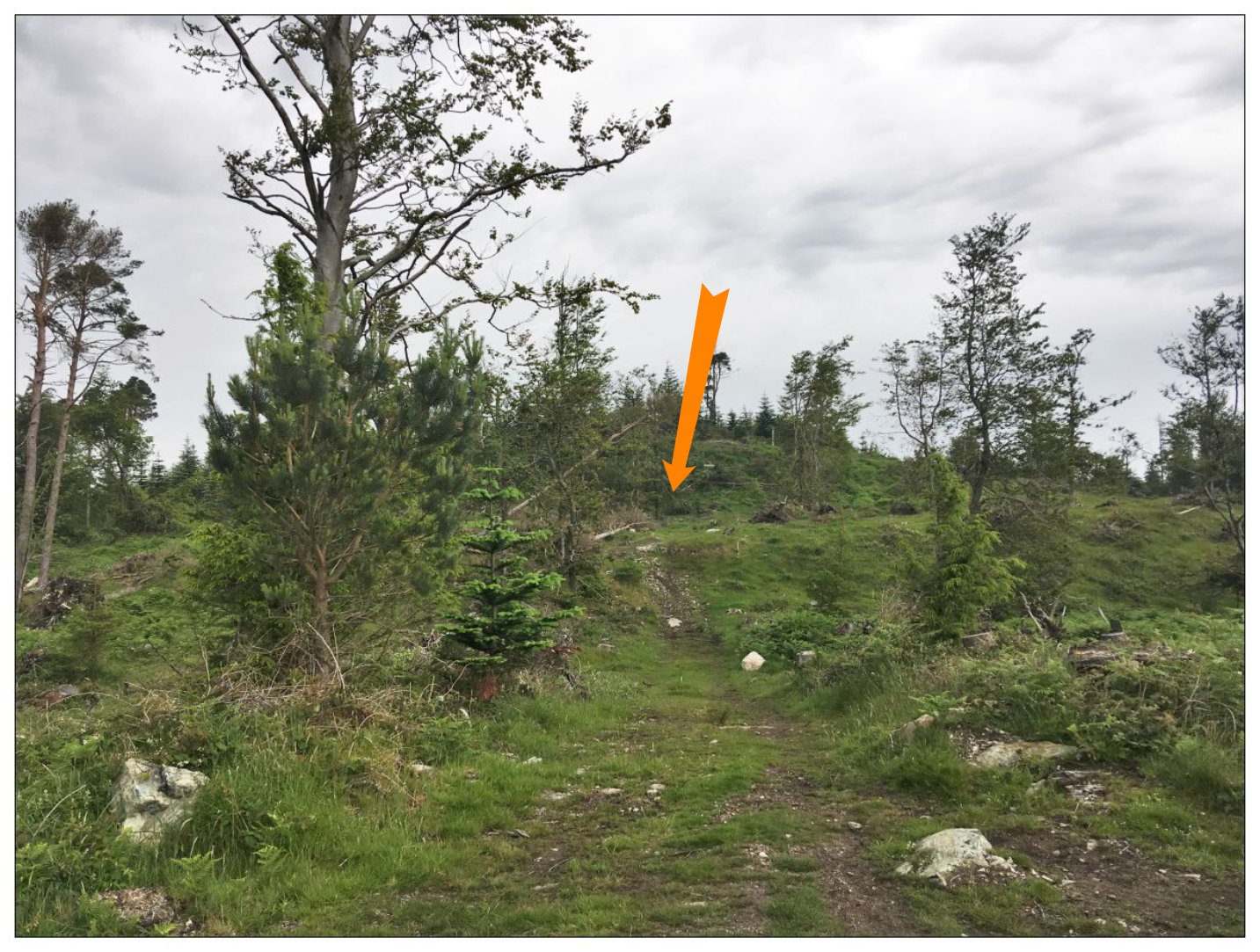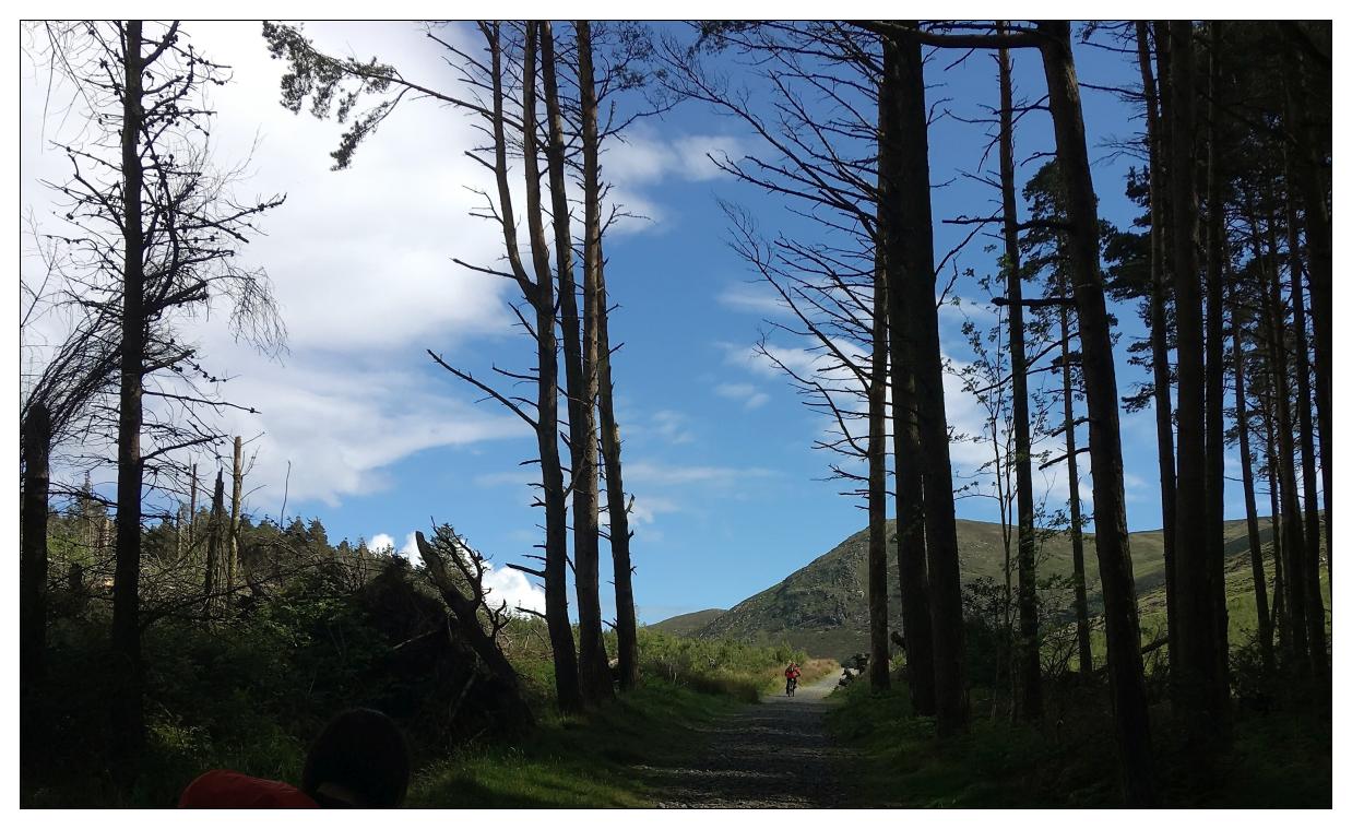 100m of steep climb on this rocky and sometimes muddy path will bring you to Curraghard open hill top with great views over the Mournes and Newcastle. As you climb you will pass through a barren rocky area, burnt in the mountain wildfire of Easter 2019. Looking around it is clear that the fire-fighters did an amazing job in preventing it spreading to the rest of the forest. This is a reminder of the constant danger of wildfires which can start so easily through the carelessness of visitors – be alert!