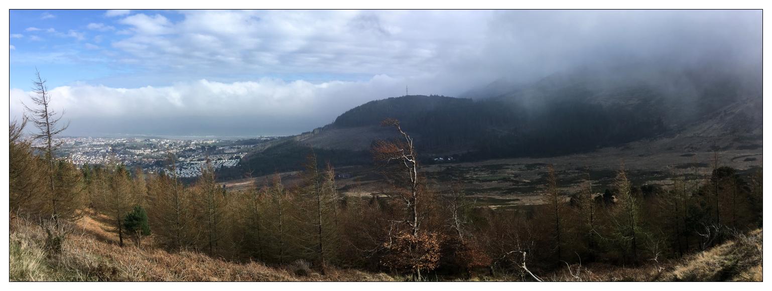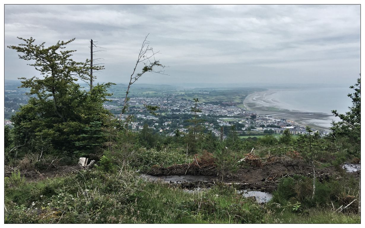 Now retrace your route back to the valley and turn left and after 350m left again onto a another forest track which now heads downhill. All the trees in this section have been recently felled, but on the plus side there are spectacular views over Newcastle and beyond to Dundrum Bay.